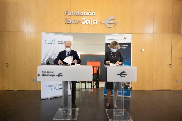 The Mobility City initiative of Fundación Ibercaja has joined its project with Cablescom. José Luis Rodrigo, CEO of Fundación Ibercaja, and Verónica Iliescu, CEO of Cablescom, have signed an agreement through which the telecommunications and signalling company becomes part of Mobility City, an international project of Fundación Ibercaja with the support from the Government of Aragon.